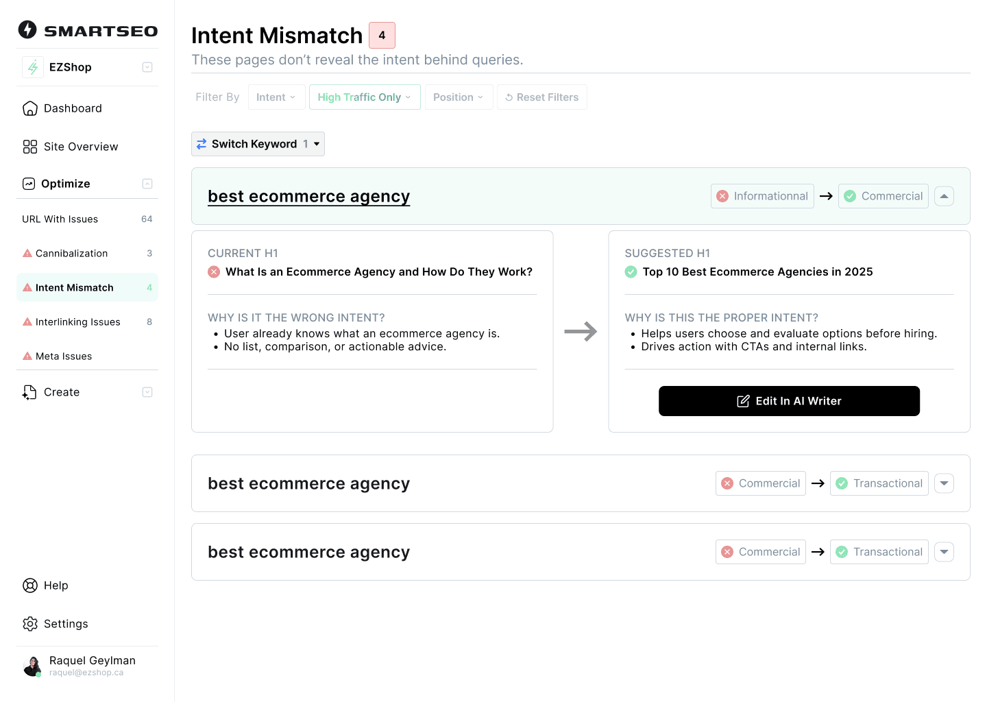 The flow had 2 ends. Some needed to be fixed in the AI writer (in-page optimization), some needed a custom interface to convey the ideal fix.